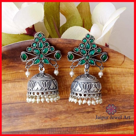 Make a lasting impression with these oxidized statement stone jhumka earrings. Designed for lovers of timeless ethnic style, these earrings feature detailed patterns and vibrant stones that stand out beautifully. Whether you’re dressing up for a wedding or a festive event, they add the perfect traditional flair. Comfortable to wear all day, these jhumkas are the ideal accessory to complete your Indian wear look.