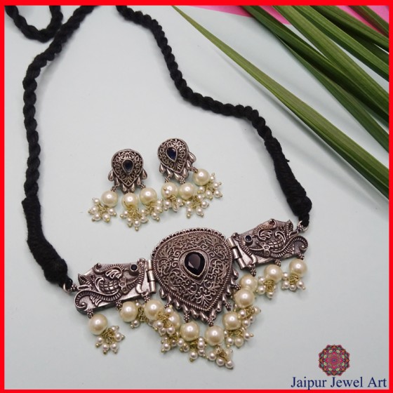 Elevate your ethnic charm with this stunning Oxidized Choker Pearl Necklace Set. Featuring intricate oxidized detailing and elegant pearl accents, this set beautifully blends traditional design with timeless grace. Perfect for weddings, festivals, or special occasions, it includes matching earrings that complete the look. The antique silver finish adds a vintage touch, making it a must-have for your jewelry collection. Pair it with a saree or lehenga to make a bold style statement that’s both classic and contemporary.
