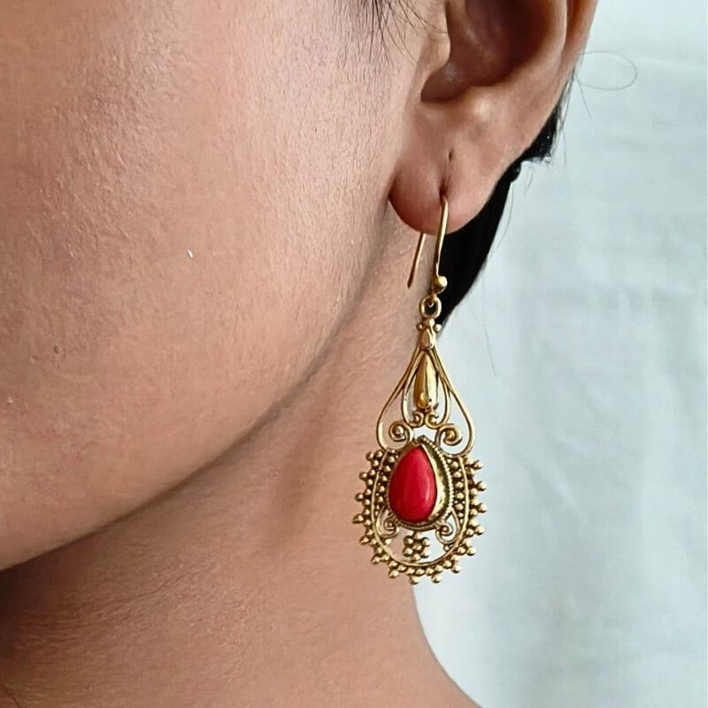 Ethnic brass coral dangle earrings featuring vibrant coral beads, perfect for festive and traditional occasions.