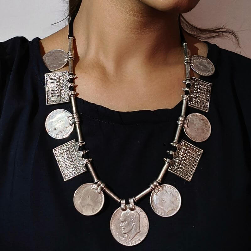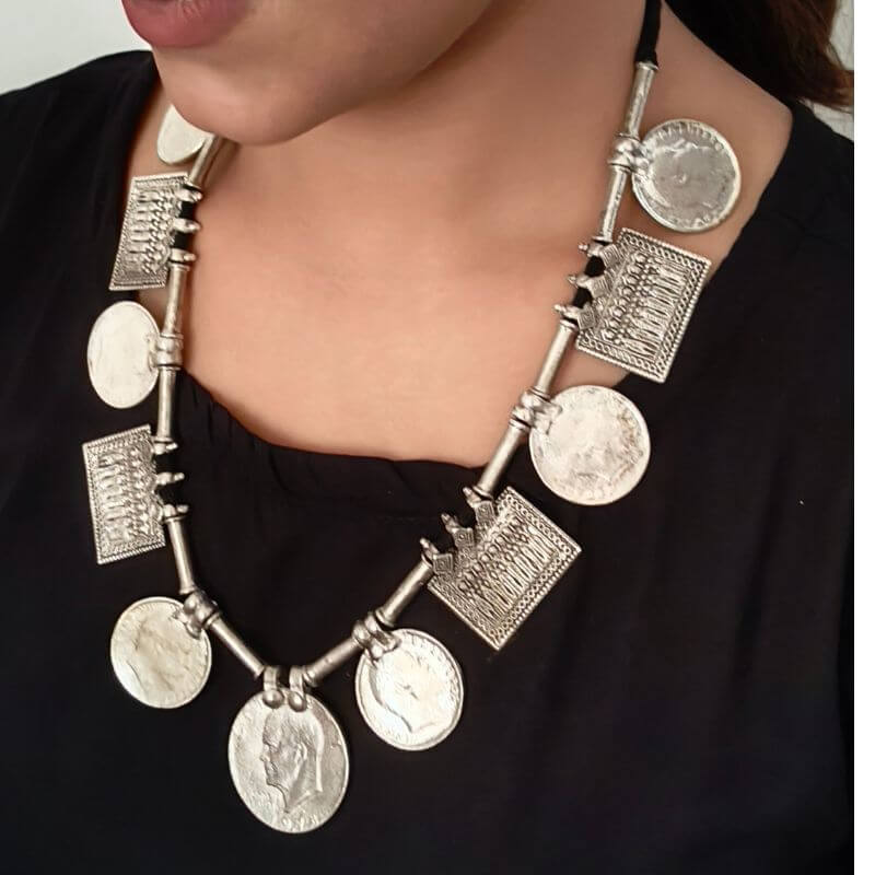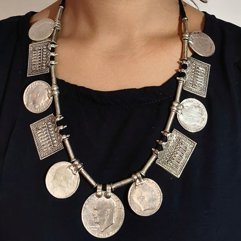 Add a touch of ethnic elegance to your wardrobe with our Long Banjara Coin Gypsy Boho Silver Necklace. Handcrafted with intricate silver detailing and authentic Banjara coins, this statement piece beautifully captures bohemian charm and traditional artistry. Perfect for festivals, casual outings, or cultural gatherings, it elevates any outfit with a unique, free-spirited flair. Lightweight yet eye-catching, this necklace pairs effortlessly with kurtas, dresses, or layered boho ensembles. Celebrate handcrafted jewelry that blends heritage, style, and timeless gypsy-inspired elegance.